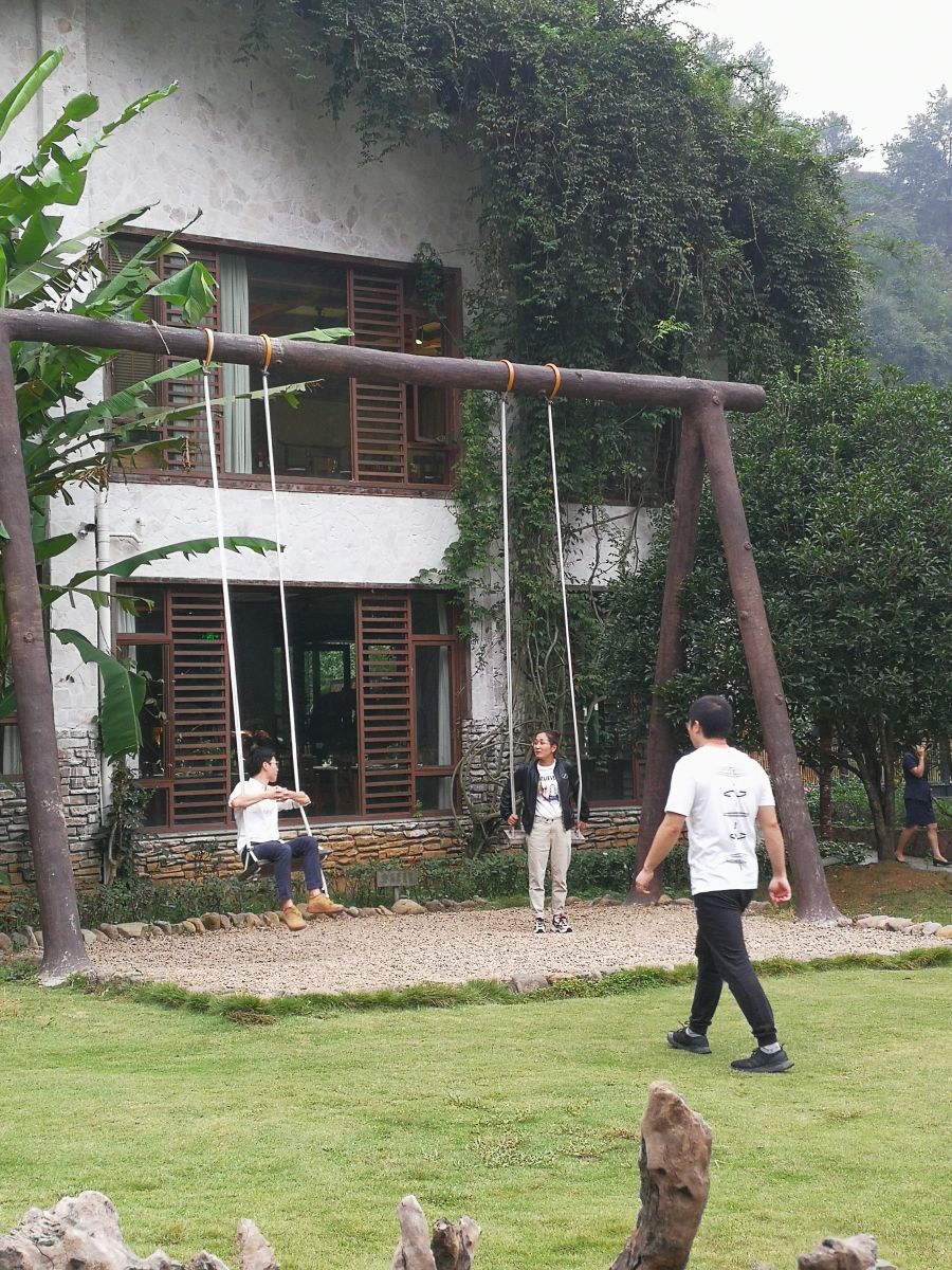 近前細(xì)看,前方小道蜿蜒,木階橫陳,隱入山林深處。拾級(jí)而上,迷霧微蒙,引人放眼望;清泉叮咚,誘人側(cè)耳聽(tīng)。踏過(guò)木橋,略過(guò)山澗,頗有“采菊東籬下,悠然見(jiàn)南山”的恬適之感。走累了,坐于一旁秋千之上,搖曳于風(fēng)中,聽(tīng)其略過(guò)耳畔的吟語(yǔ),想來(lái)安適便莫過(guò)于此。
